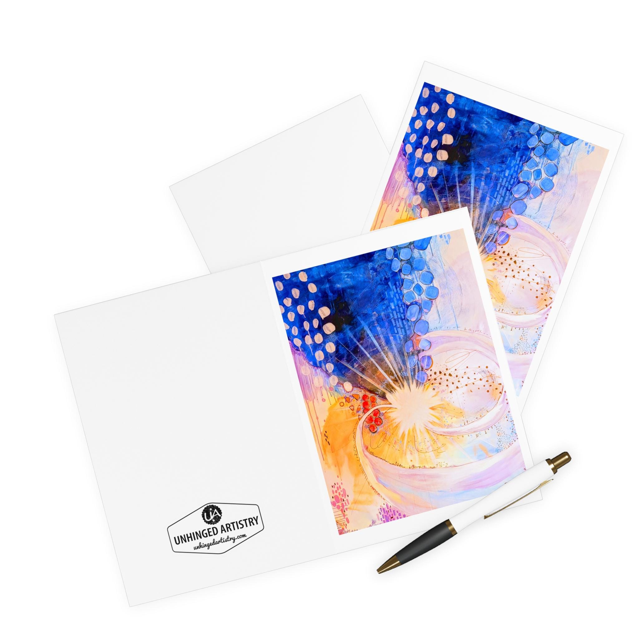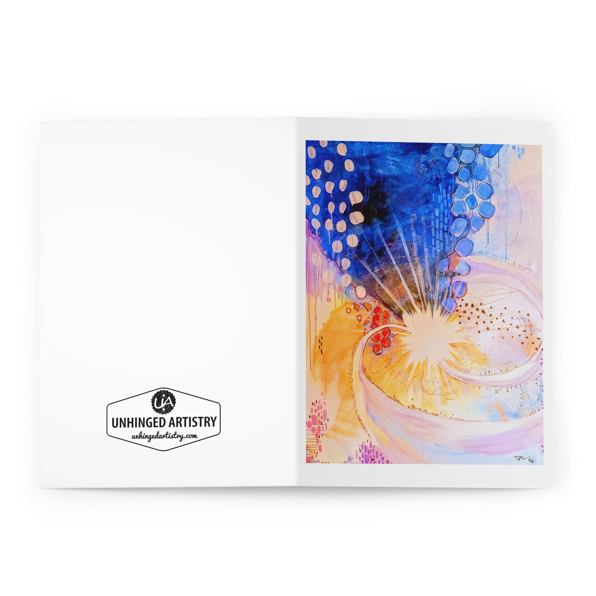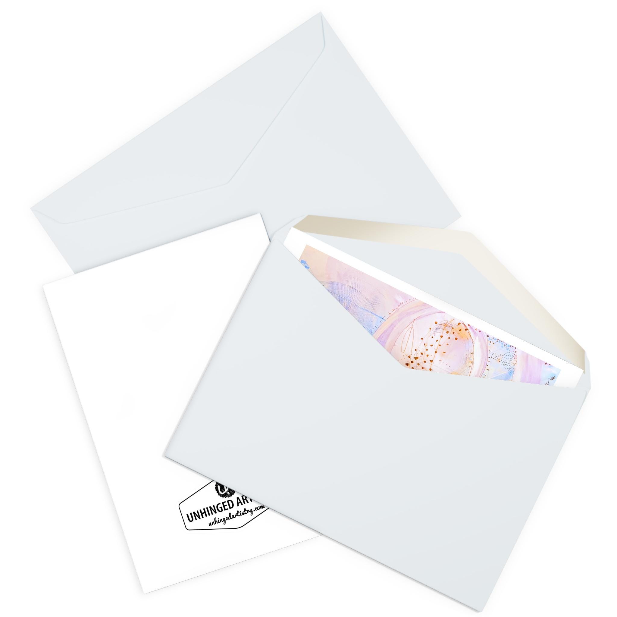 These personalized greeting cards show a print of the painting "Spark" by Unhinged Artistry artist Jess Passaro. They help you send your warmest regards while allowing the sender's personality to shine through. Their semi-glossy finish adds a beautiful shine while the matching white envelopes create a complete package. Each order gets you a set of 5x personalized greetings cards.