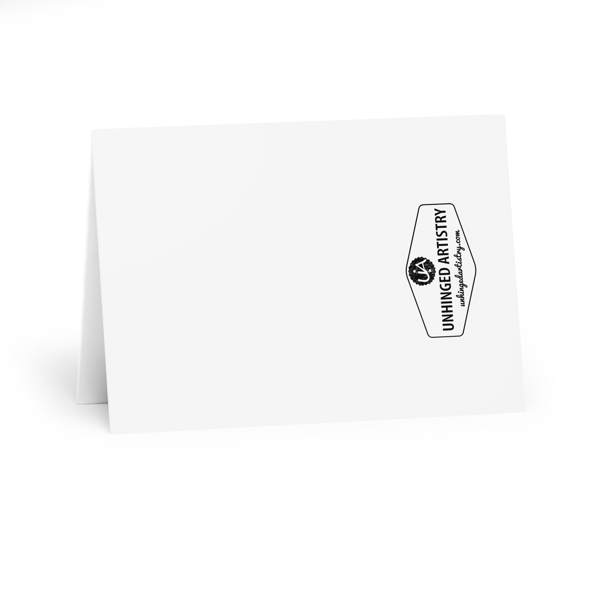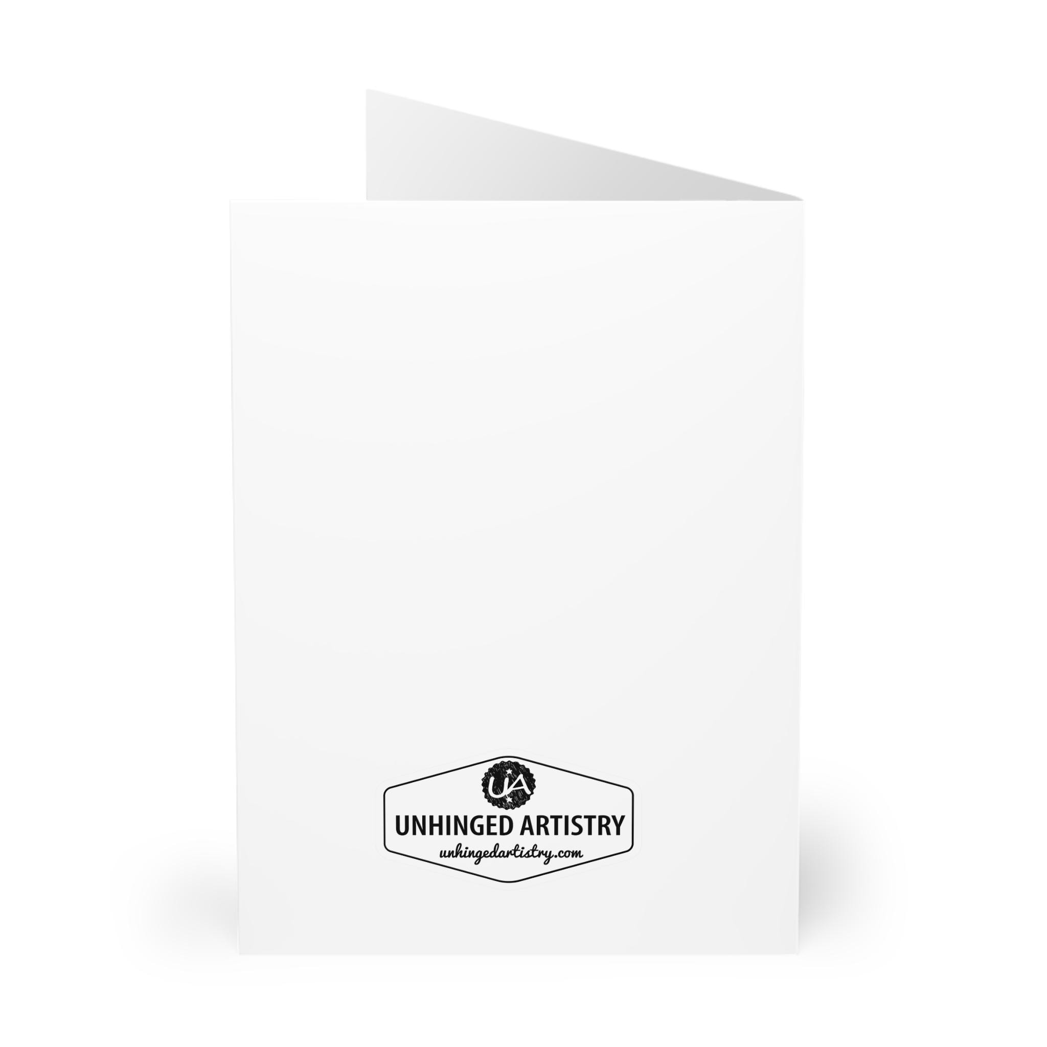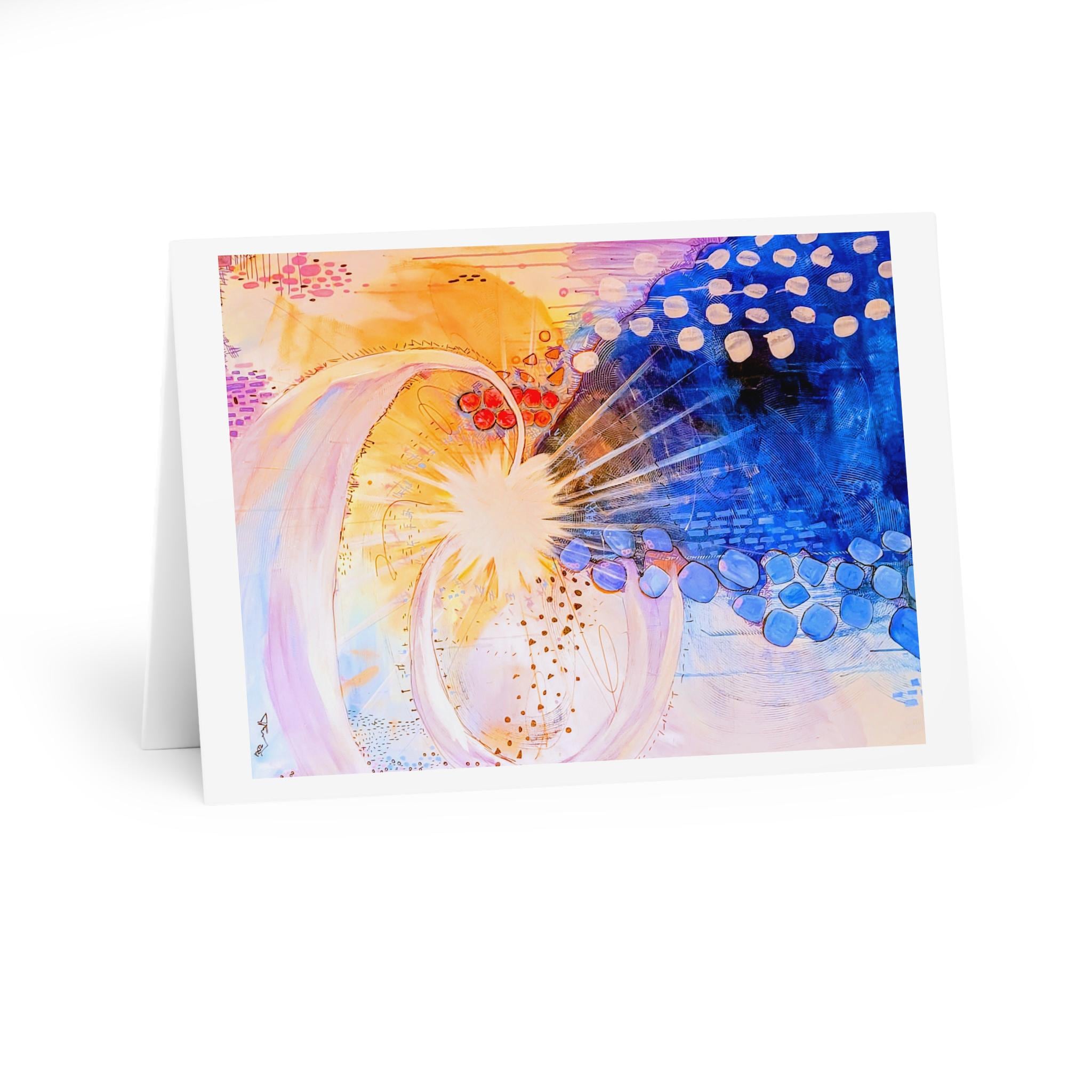 These personalized greeting cards show a print of the painting "Spark" by Unhinged Artistry artist Jess Passaro. They help you send your warmest regards while allowing the sender's personality to shine through. Their semi-glossy finish adds a beautiful shine while the matching white envelopes create a complete package. Each order gets you a set of 5x personalized greetings cards.