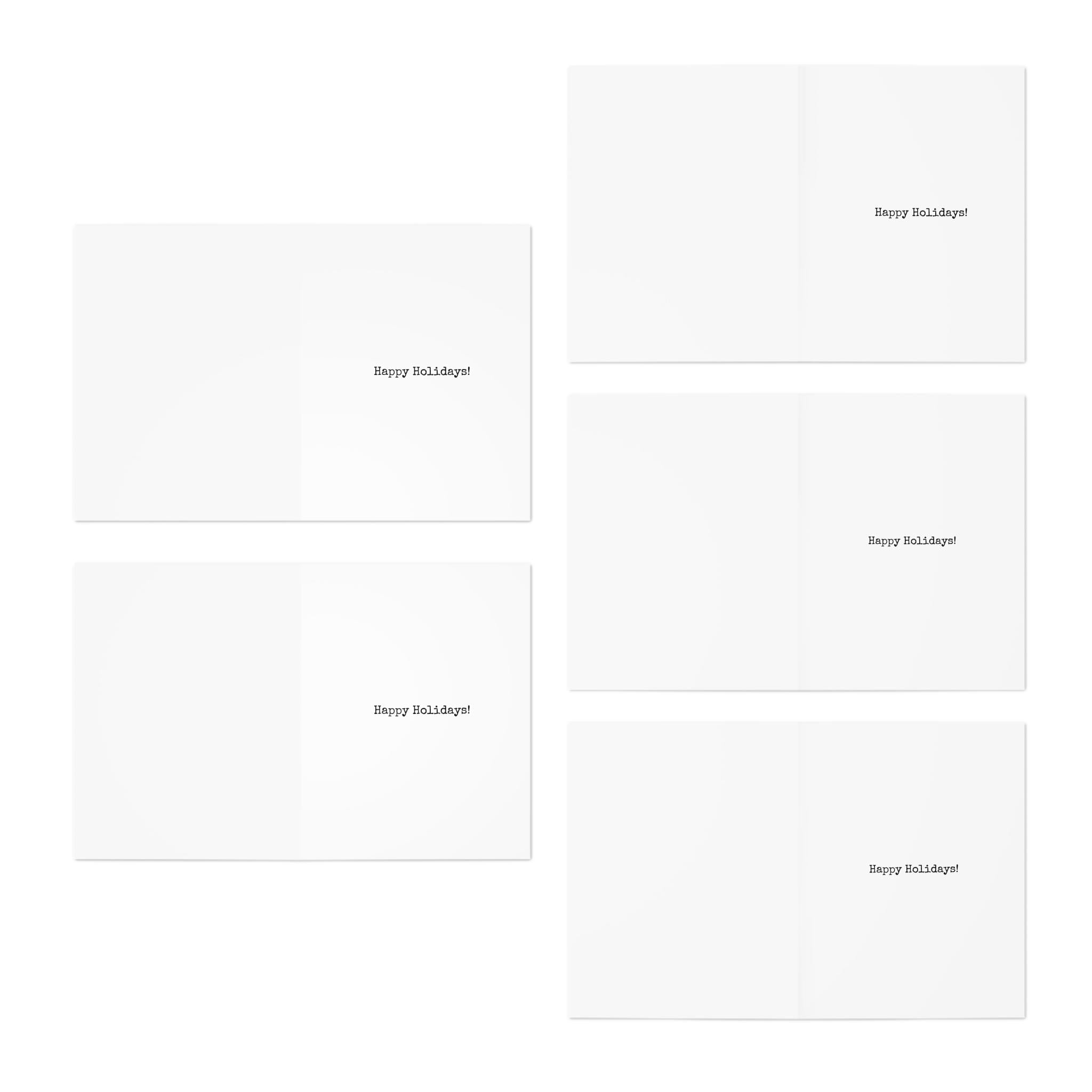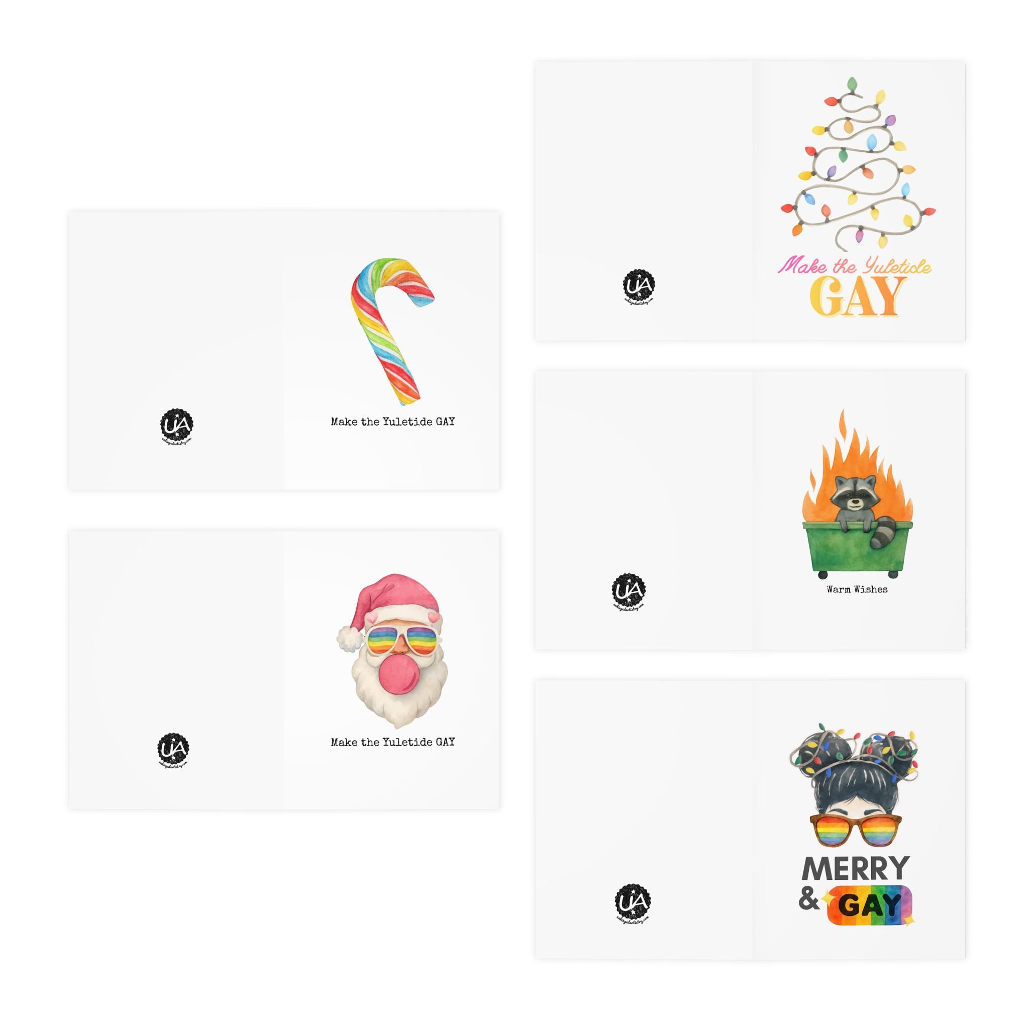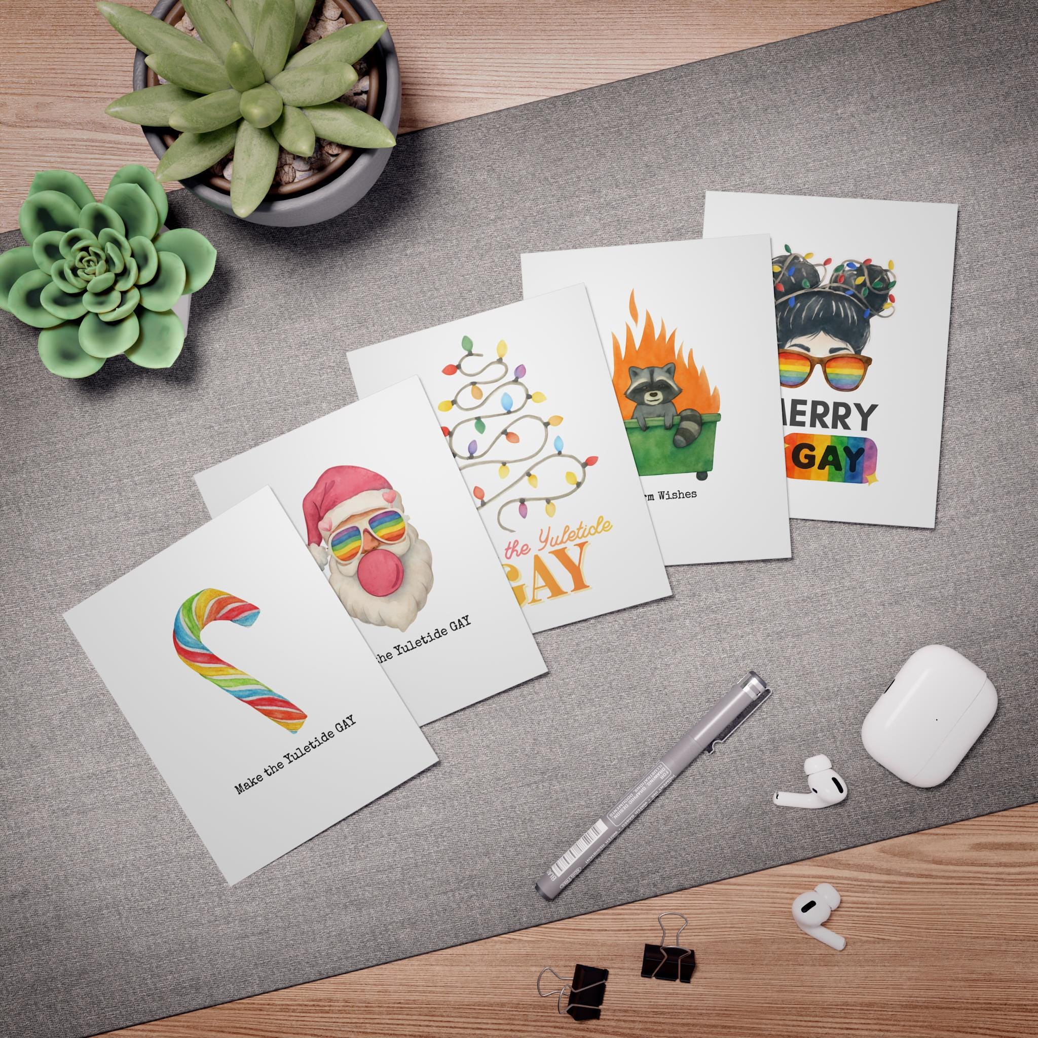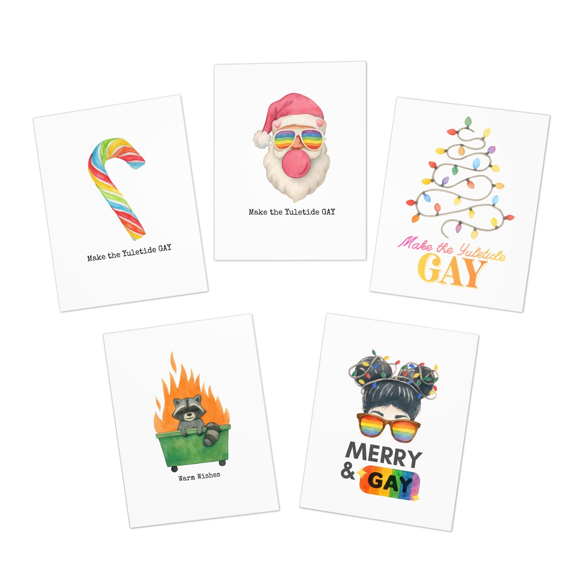 A cheerful 5-card set that brings color, queer joy, and playful holiday spirit to every exchange. Each heavyweight 4.25" x 5.5" card is printed on 271gsm uncoated paper with crisp, vibrant inks so illustrations pop — think rainbow candy canes, a sunglasses-wearing Santa with bubblegum pink, and a twinkling tree wrapped in colorful lights and the phrase “Make the Yuletide GAY.” Cards arrive with matching white envelopes and use a standard overlapping front cover. Assembled in the USA from globally sourced parts, this pack suits people who celebrate the season with bright humor and inclusive cheer.