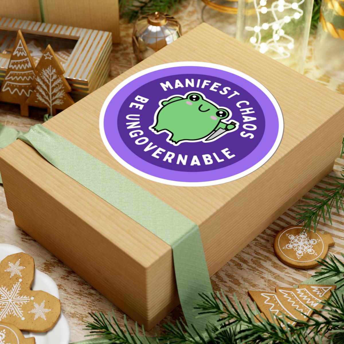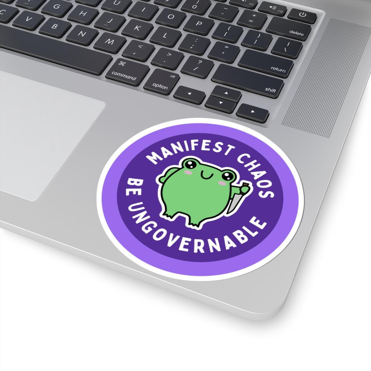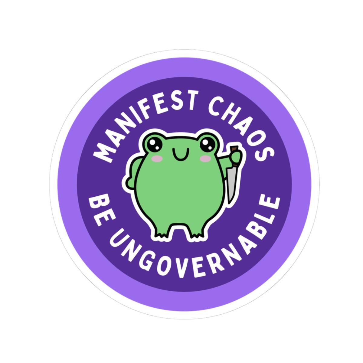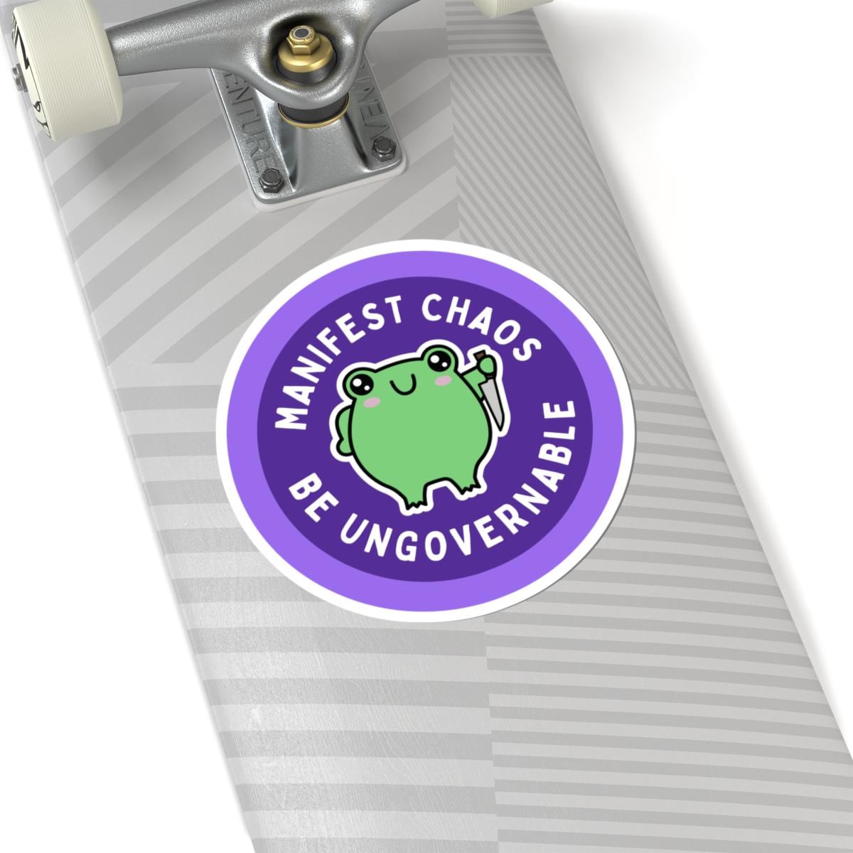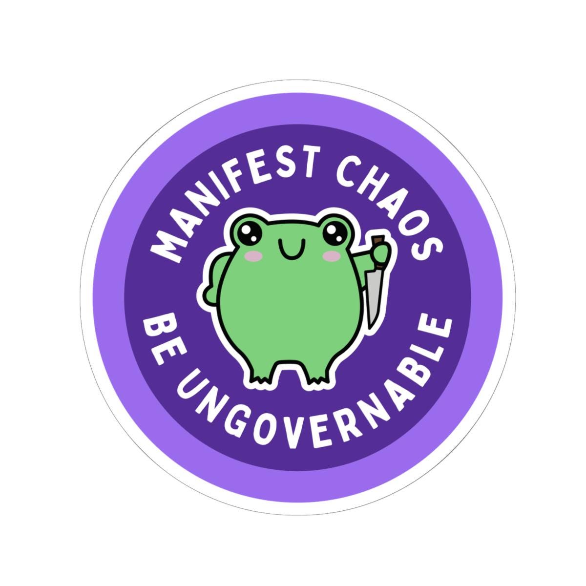 Bright, glossy kiss-cut stickers that bring playful chaos to your everyday surfaces. A chubby green frog holding a wand smiles from a bold purple badge while the phrase “MANIFEST CHAOS — BE UNGOVERNABLE” wraps around it. These stickers stick smooth and flat to laptops, journals, water bottle exteriors (indoor use), and more — adding a cheeky, rebellious accent to the things you carry and the spaces you claim. The glossy finish makes colors pop and gives a lightly reflective, durable look that reads as fun and confident. Choose white or transparent backing and one of four sizes to match where you want to place it. Apply slowly for a bubble-free result and enjoy a sticker that champions playful disruption.