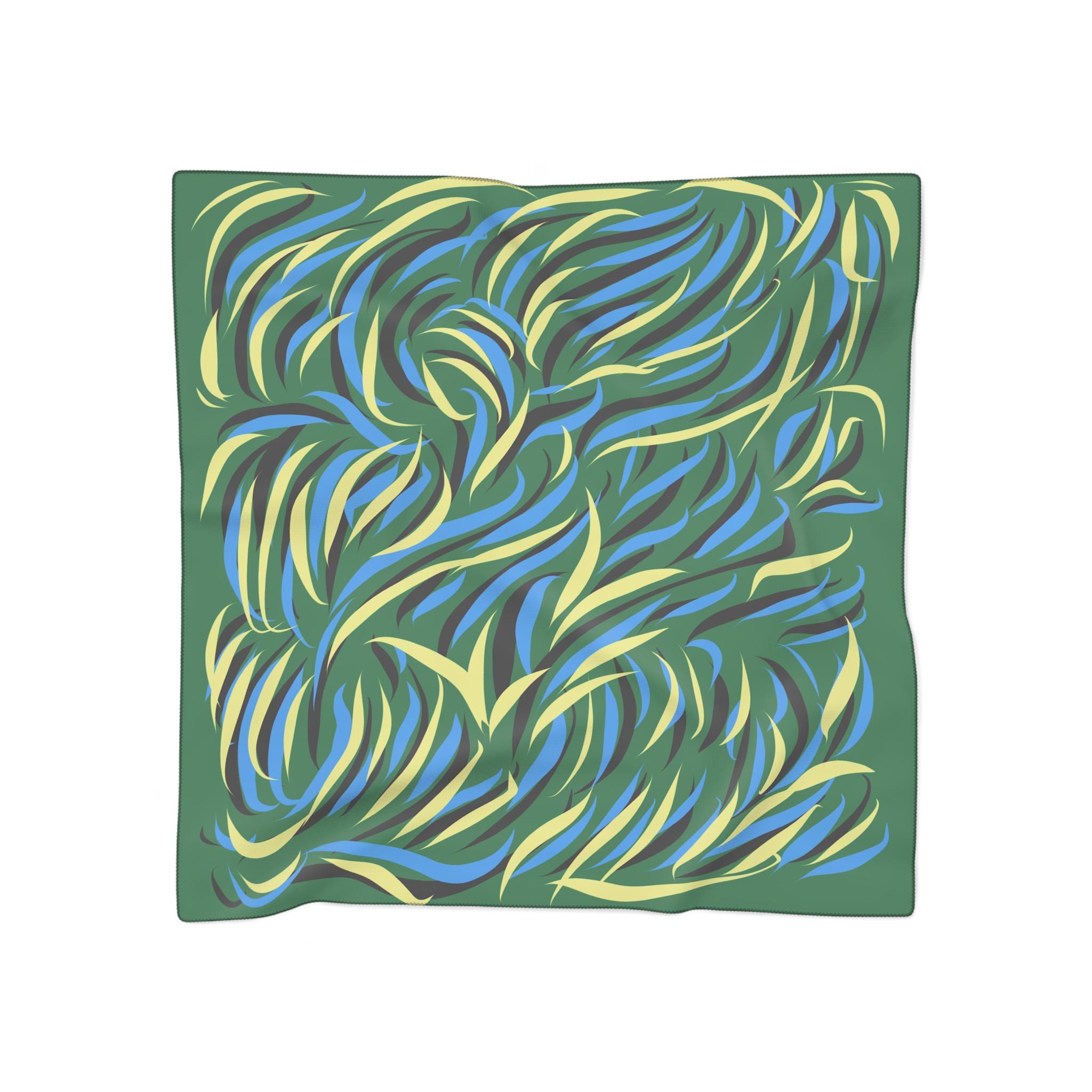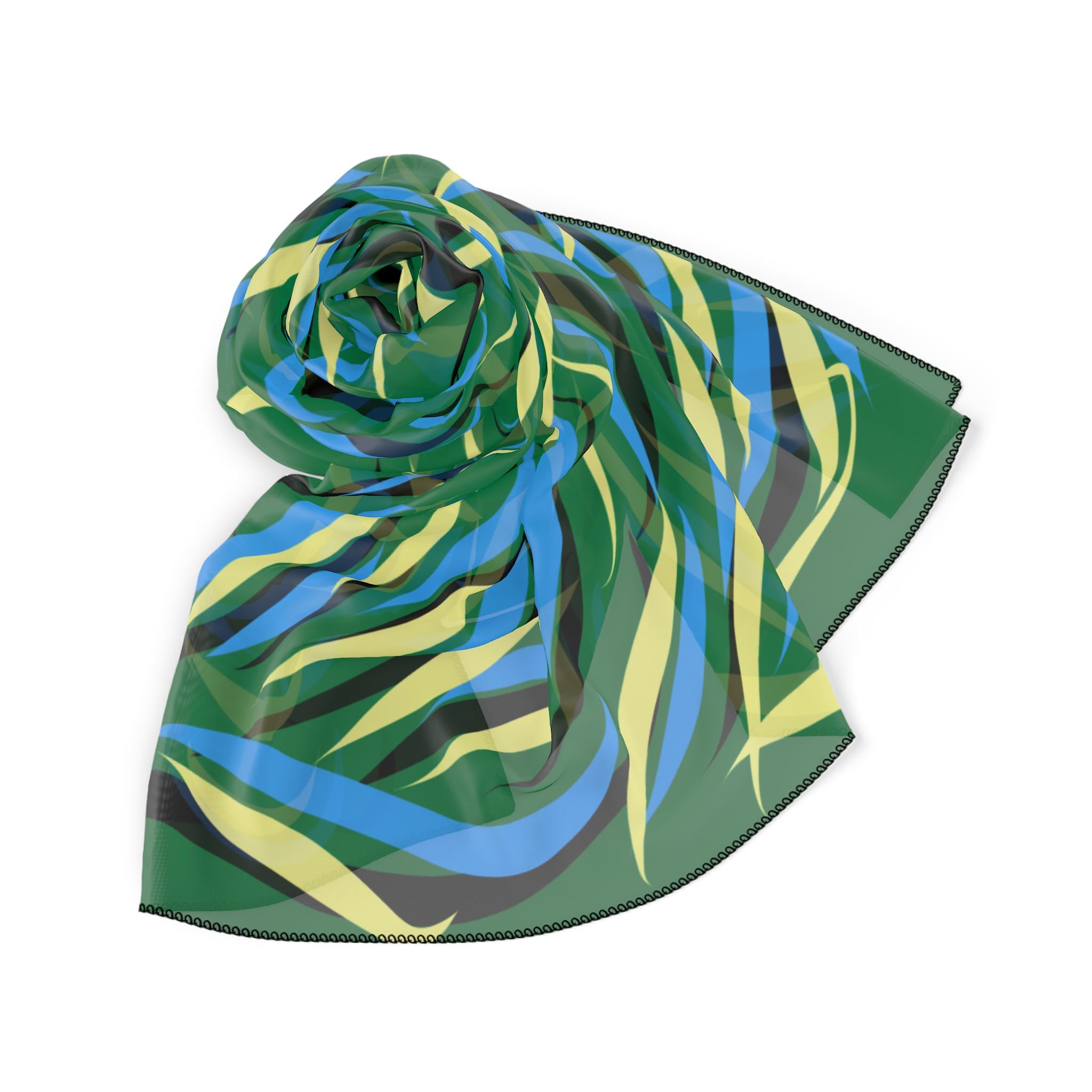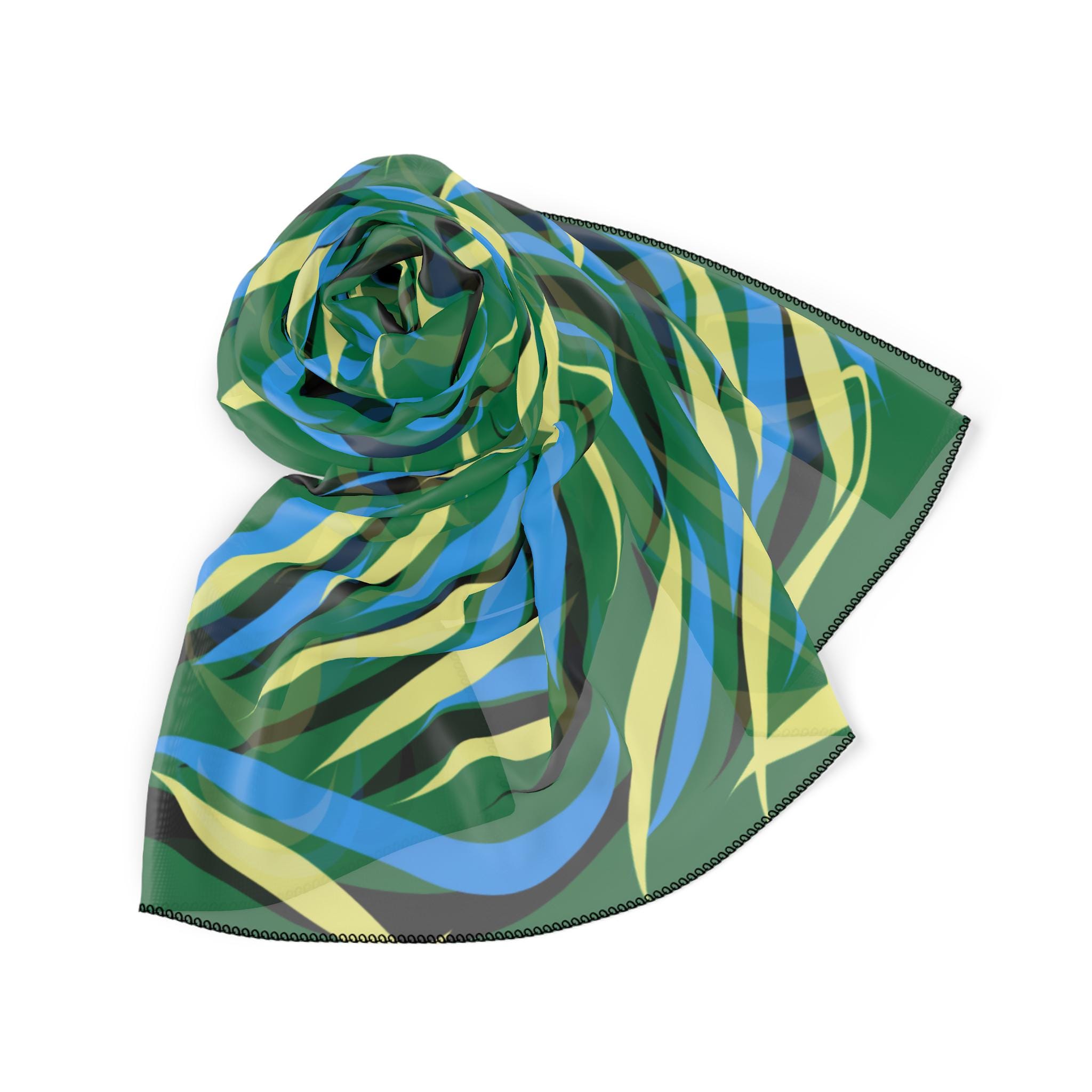 A vibrant, swirly digital painting scarf in blue, yellow, black, and green, perfect for adding a pop of color and style to any outfit. This lightweight and airy scarf is ideal for those who love unique and artistic accessories. Perfect for fashion-forward individuals looking to stand out during any season.