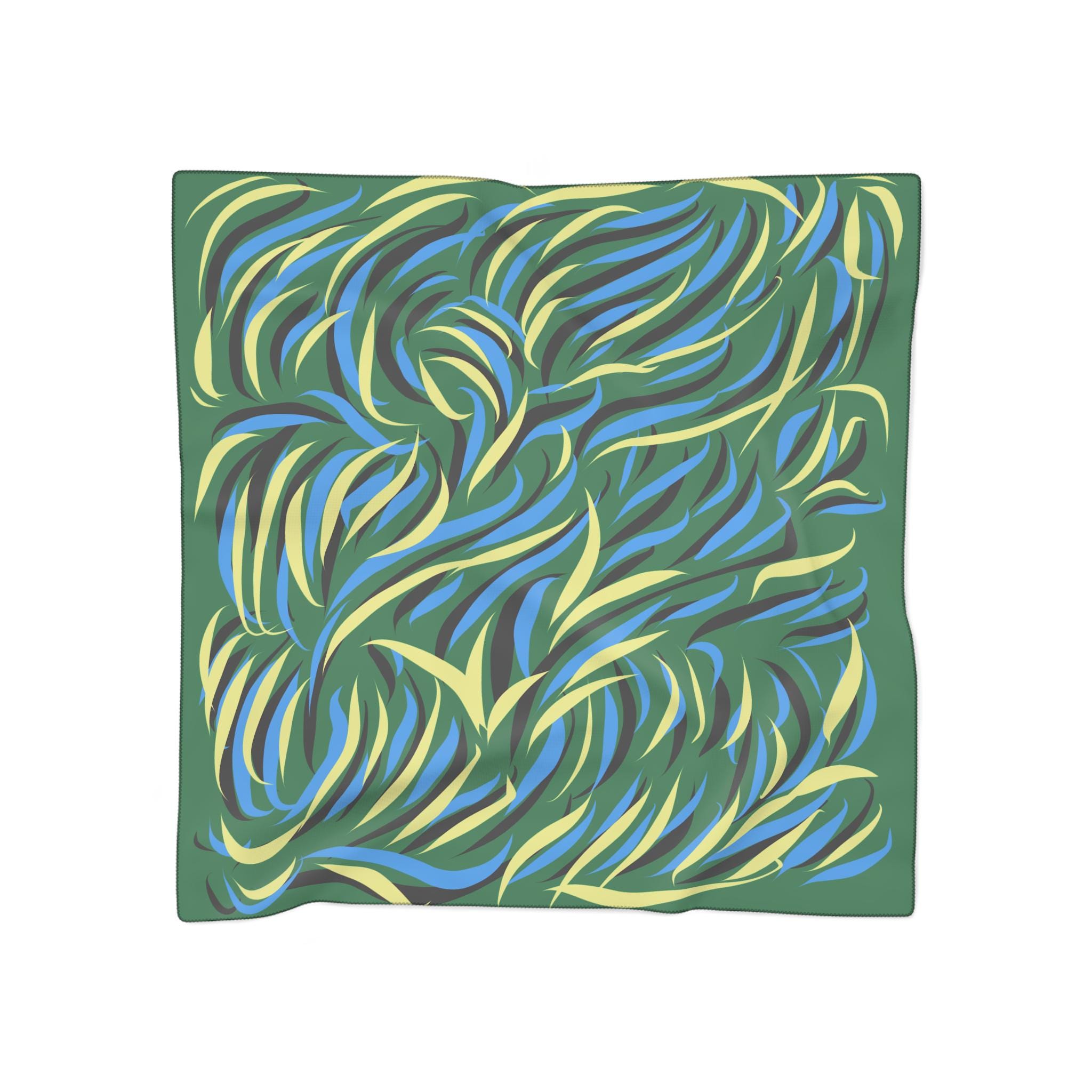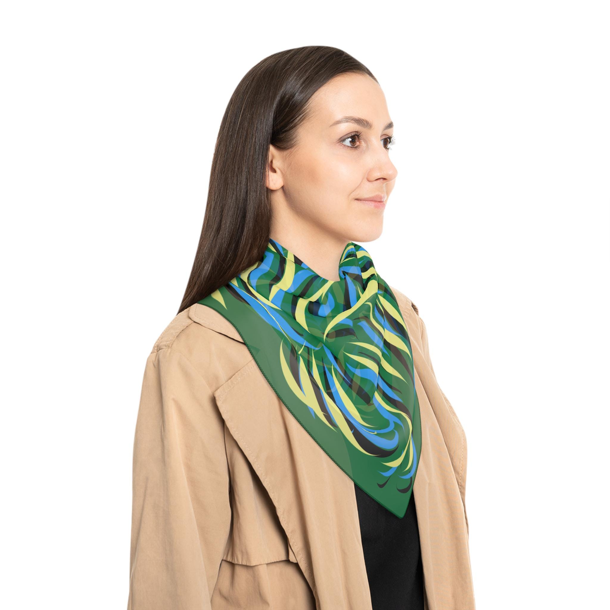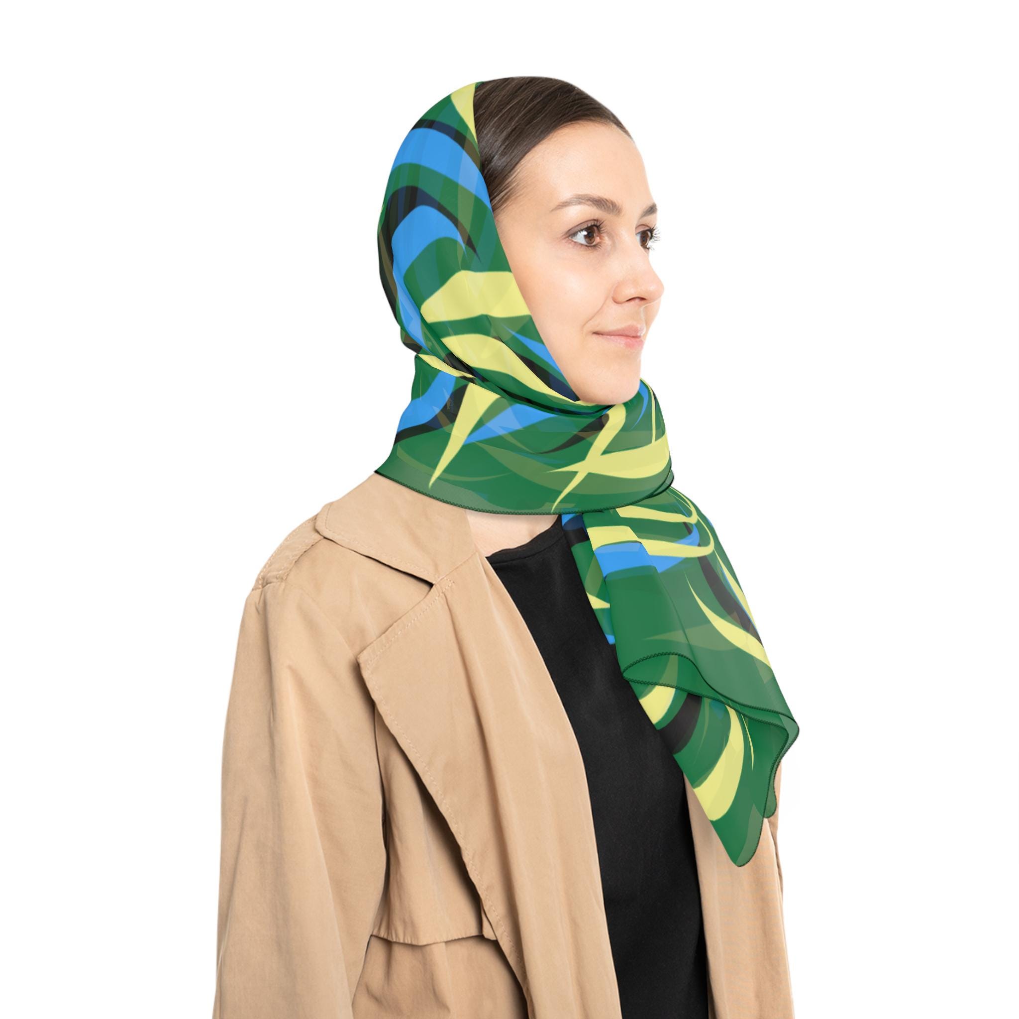 A vibrant, swirly digital painting scarf in blue, yellow, black, and green, perfect for adding a pop of color and style to any outfit. This lightweight and airy scarf is ideal for those who love unique and artistic accessories. Perfect for fashion-forward individuals looking to stand out during any season.